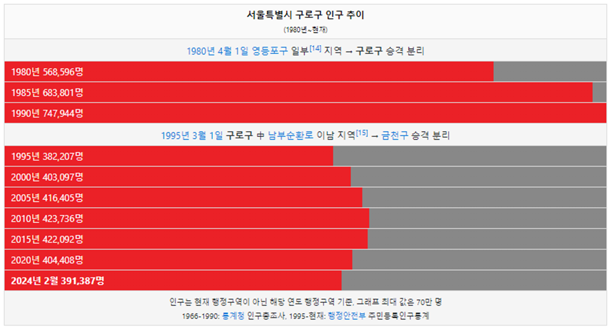 구로구 인구는 1980년 56만명 이었습니다. 그리고 1990년 인구 74만명으로 가장 많은 인구가 거주했고 이후 남부순환로 이남 지역이 금천구로 승격 분리되면서 인구가 줄었습니다. 2024년 현재 39만명이 구로구에 거주하고 있습니다.