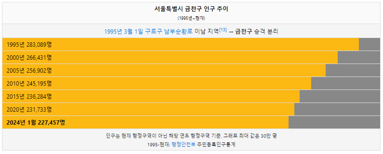 금천구 인구는 1995년 28만명으로 가장 많은 인구가 거주했습니다. 이후 인구가 꾸준히 감소했습니다. 2024년 현재 22만명이 금천구에 거주하고 있습니다.
