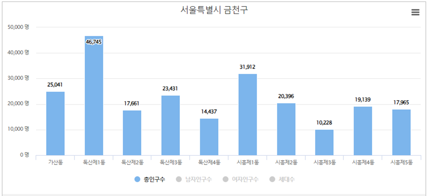 금천구에서 독산제1동이 인구가 가장 많으며 인구는 46,745 명, 세대수는 25,644 입니다. 두번째로는 시흥제1동 인구가 많고 인구 31,912 명, 세대수는 16,373 입니다. 세번째는 가산동으로 인구는 25,041 명, 세대수는 18,516 입니다.