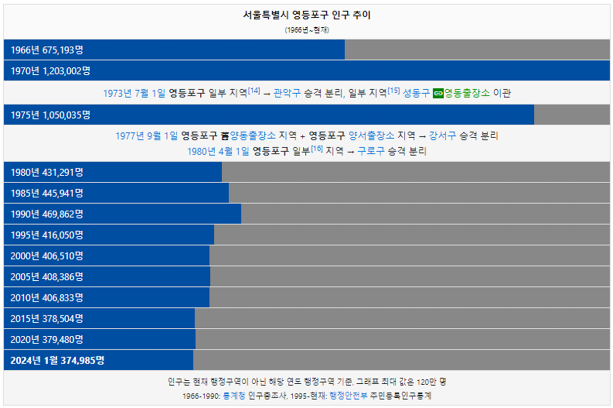 영등포구 인구는 1966년 67만명 이었습니다. 그리고 1970년 인구 120만명으로 가장 많은 인구가 거주했고 이후 구의 일부가 관악구와 강서구, 구로구로 승격 분리되면서 인구가 줄었습니다. 이후 인구가 꾸준히 감소했습니다. 2024년 현재 37만명이 영등포구에 거주하고 있습니다.