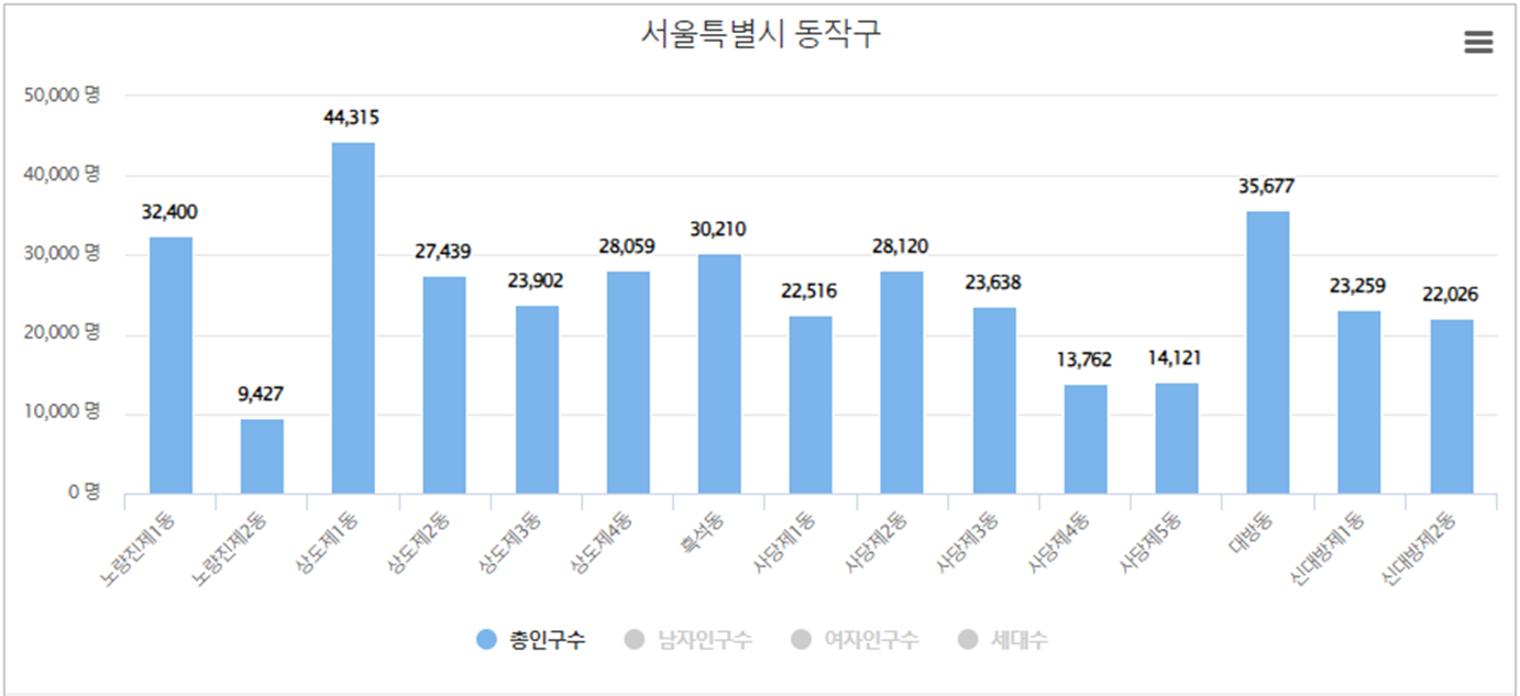 동작구에서 상도제1동이 인구가 가장 많으며 인구는 44,315 명, 세대수는 22,884 입니다. 두번째로는 대방동 인구가 많고 인구 35,677 명, 세대수는 16,787 입니다. 세번째는 노량진제1동으로 인구는 32,400 명, 세대수는 17,389 입니다.