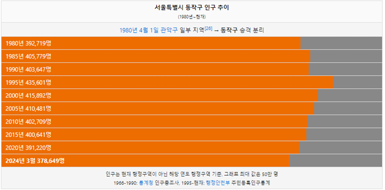 동작구 인구는 1980년 39만명 이었습니다. 그리고 1995년 인구 43만명으로 가장 많은 인구가 거주했고 이후 인구가 꾸준히 감소했습니다. 2024년 현재 37만명이 동작구에 거주하고 있습니다.