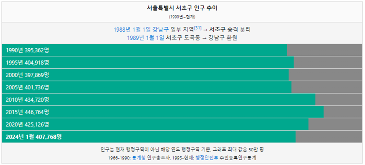 서초구 인구는 1990년 39만명 이었습니다. 그리고 2015년 인구 44만명으로 가장 많은 인구가 거주했고 이후 인구가 꾸준히 감소했습니다. 2024년 현재 40만명이 서초구에 거주하고 있습니다.