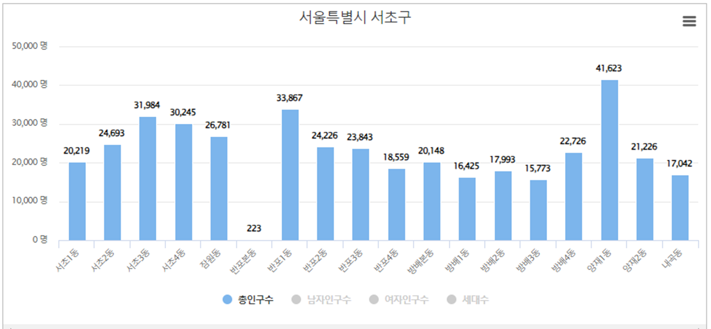 서초구에서 양재1동이 인구가 가장 많으며 인구는 41,623 명, 세대수는 17,757 입니다. 두번째로는 반포1동 인구가 많고 인구 33,867 명, 세대수는 14,737 입니다. 세번째는 서초3동으로 인구는 31,984 명, 세대수는 15,364 입니다.