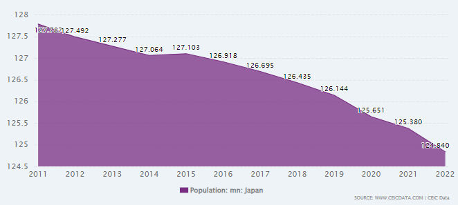 일본 인구는 2007년부터 매년 감소하고 있습니다. 감소폭이 매년 증가하고 있으며 2022년에는 직전 연도 대비 76만 명이 감소하였습니다.