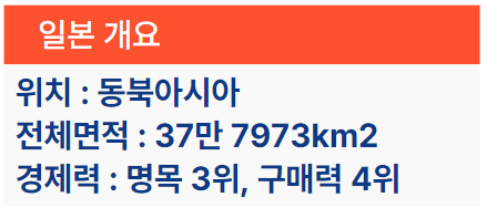 일본은 동아시아에 있는 국가이다. 태평양에 있는 일본 열도의 네 개의 큰 섬(혼슈, 규슈, 시코쿠, 홋카이도)과 이들 주변에 산재한 작은 섬들로 구성되어 있다. 일본의 전체 면적은 37만 7973 km2이며, 독일(35만 7386km2)보다 조금 크다.