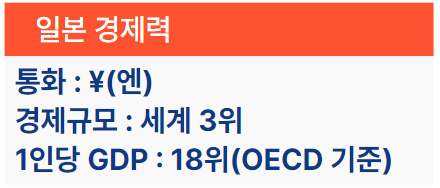 일본은 수정 자본주의 경제 체제를 채택하고 있으며, 통화 단위는 엔(円, ¥, Yen, JPY)이다. 국내총생산의 규모비로는 세계 제3위의 경제 대국으로, 일본의 경제 동향은 세계 경제에 큰 영향을 준다. 일본인들은 경제적 동물(economic animal)로 지구촌에 많이 알려져 있다. 그러나 1990년대 IT산업을 미국이 주도하면서 그 영향력이 감소되고, 이는 곧 일본 금융계의 무분별한 투자로 인한 토지의 불량 채권화를 가속화하여 경제에 치명타를 가하고 말았다.