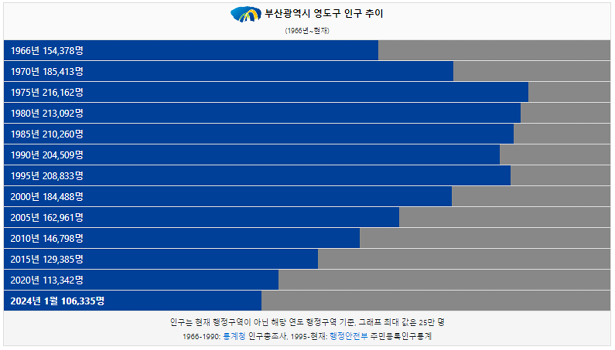 영도구 인구는 1966년 15만명 이었습니다. 이후 1975년 20만명 돌파 후 2000년에 다시 인구가 20만명 이하로 감소했고 이후에도 인구가 꾸준하게 감소했습니다. 2024년 현재 10만명이 영도구에 거주하고 있습니다.