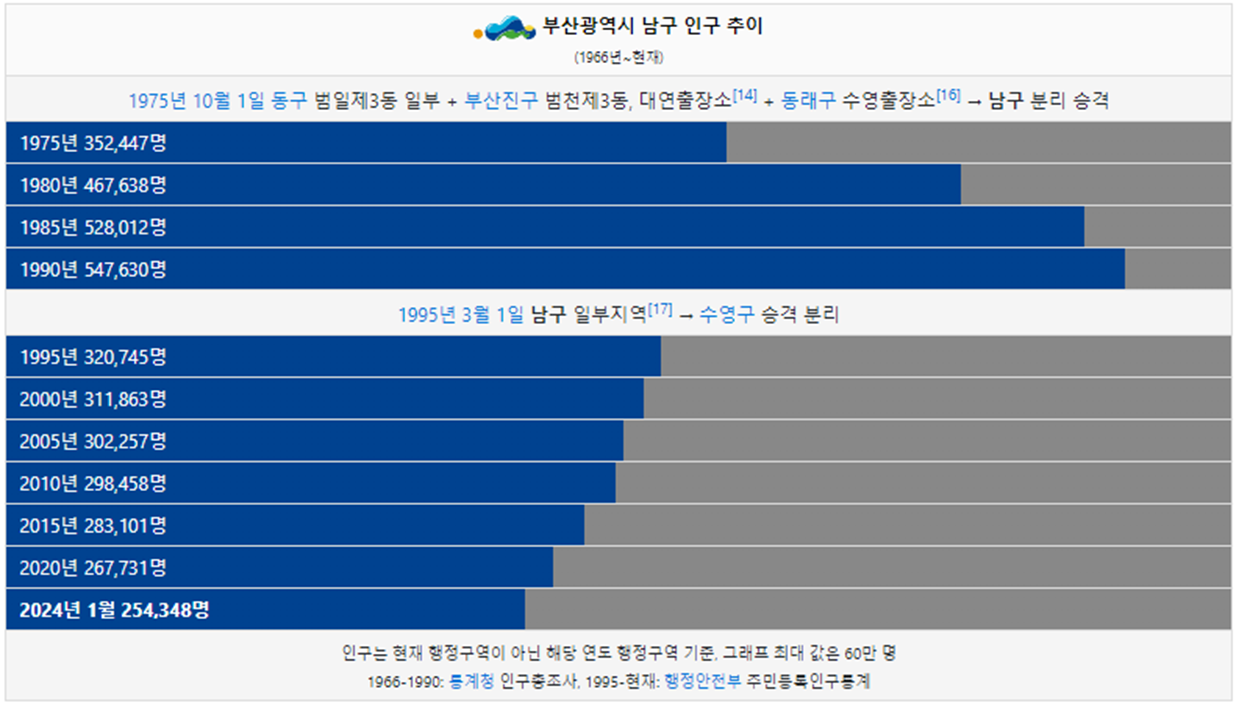남구 인구는 1975년 35만명 이었습니다. 그리고 1985년 인구가 처음으로 50만명을 돌파했습니다. 이후 남구 일부지역이 수영구로 승격 분리되면서 1995년 32만명 이하로 감소했습니다. 2024년 현재 25만명이 남구에 거주하고 있습니다.