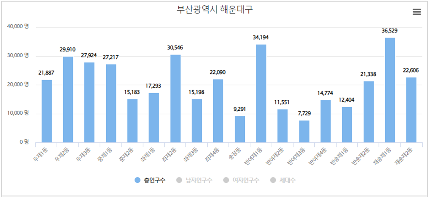 해운대구에서 재송제1동이 인구가 가장 많으며 인구는 36,529 명, 세대수는 14,498 입니다. 두번째로는 반여제1동 인구가 많고 인구 34,194 명, 세대수는 13,399 입니다. 세번째는 좌제2동으로 인구는 30,546 명, 세대수는 14,119 입니다.