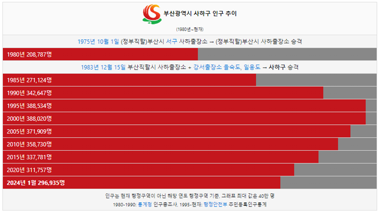 사하구 인구는 1980년 20만명 이었습니다. 그리고 1995년 가장 많은 인구인 38만명이 거주했고 이후 인구가 조금씩 감소했습니다. 2024년 현재 29만명이 사하구에 거주하고 있습니다.