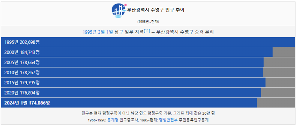수영구 인구는 1995년 20만명 이었습니다. 그리고 2000년 인구가 처음으로 20만명 이하로 감소했고 이후에도 인구가 꾸준하게 감소했습니다. 2023년 현재 17만명이 수영구에 거주하고 있습니다.