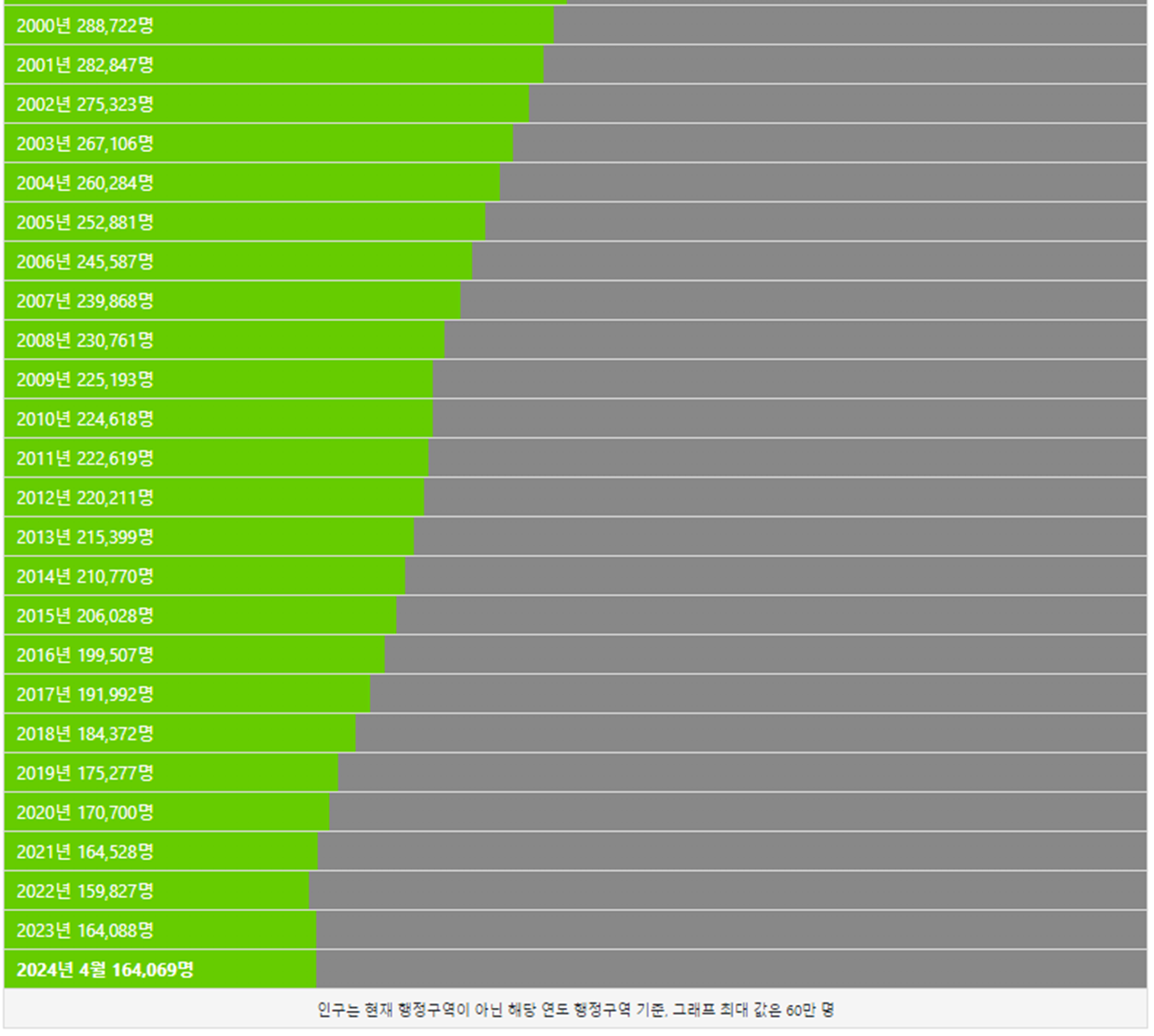 서구 인구는 2000년 28만명 이었습니다. 이후에 인구가 계속해서 감소했고,  2024년 현재 16만 명이 서구에 거주하고 있습니다.