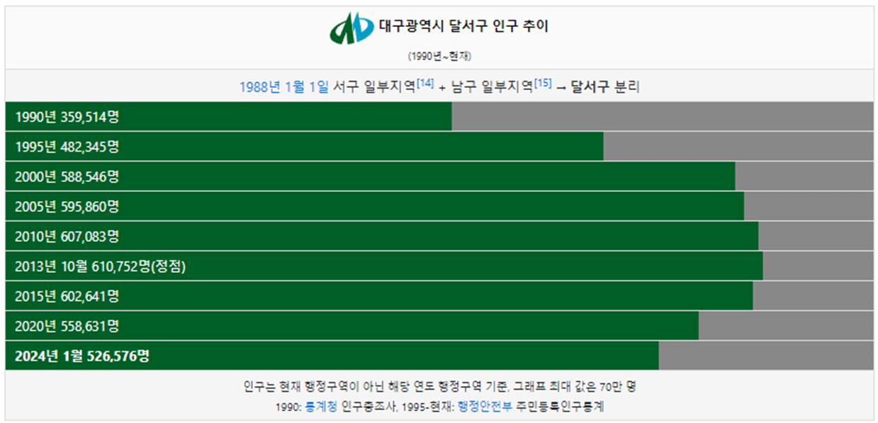 달서구 인구는 1990년 35만명 이었습니다. 그리고 2010년 인구가 처음으로 60만명을 돌파했고 이후에 인구가 계속해서 감소했습니다. 2024년 현재 52만명이 달서구에 거주하고 있습니다.