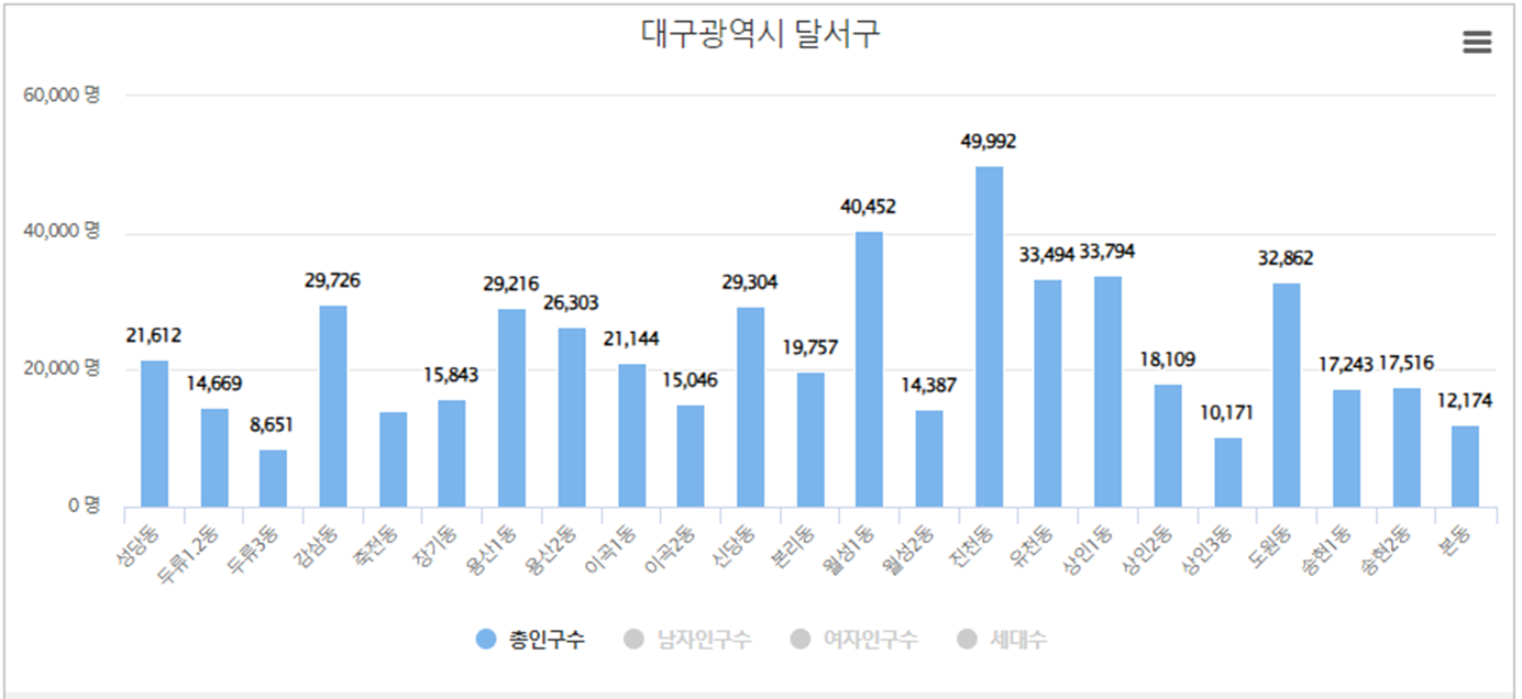 달서구에서 진천동이 인구가 가장 많으며 인구는 49,992 명, 세대수는 21,195 입니다. 두번째로는 월성1동 인구가 많고 인구 40,452 명, 세대수는 13,342 입니다. 세번째는 상인1동으로 인구는 33,794 명, 세대수는 12,915 입니다.