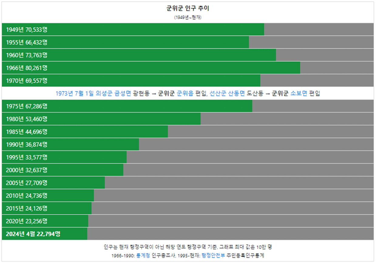 군위군 인구는 1949년 7만명 이었습니다. 그리고 1966년 인구가 처음으로 8만명을 돌파했고 이후에 인구가 계속해서 감소했습니다. 2024년 현재 2만명이 군위군에 거주하고 있습니다.