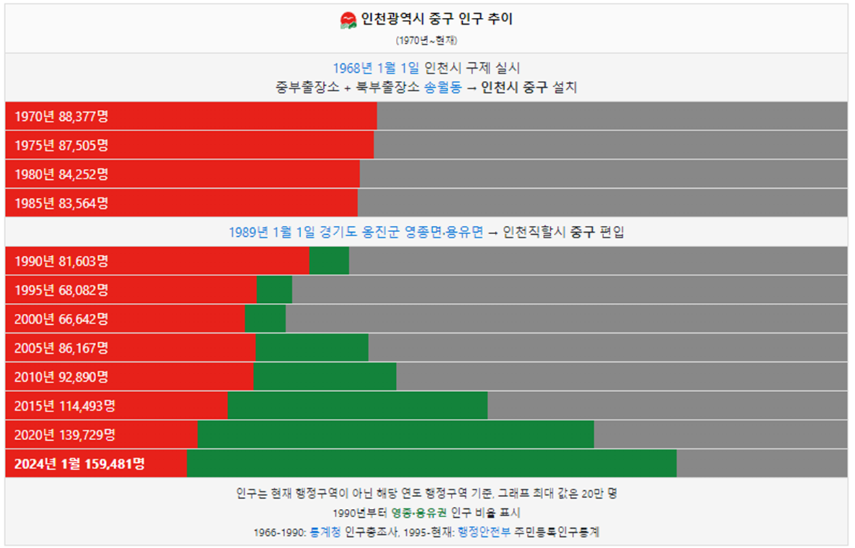 중구 인구는 1970년 8만 9천명 이었습니다. 그리고 2015년 인구가 처음으로 10만명을 돌파했고 이후에 인구가 계속해서 증가했습니다. 2024년 현재 15만명이 중구에 거주하고 있습니다.