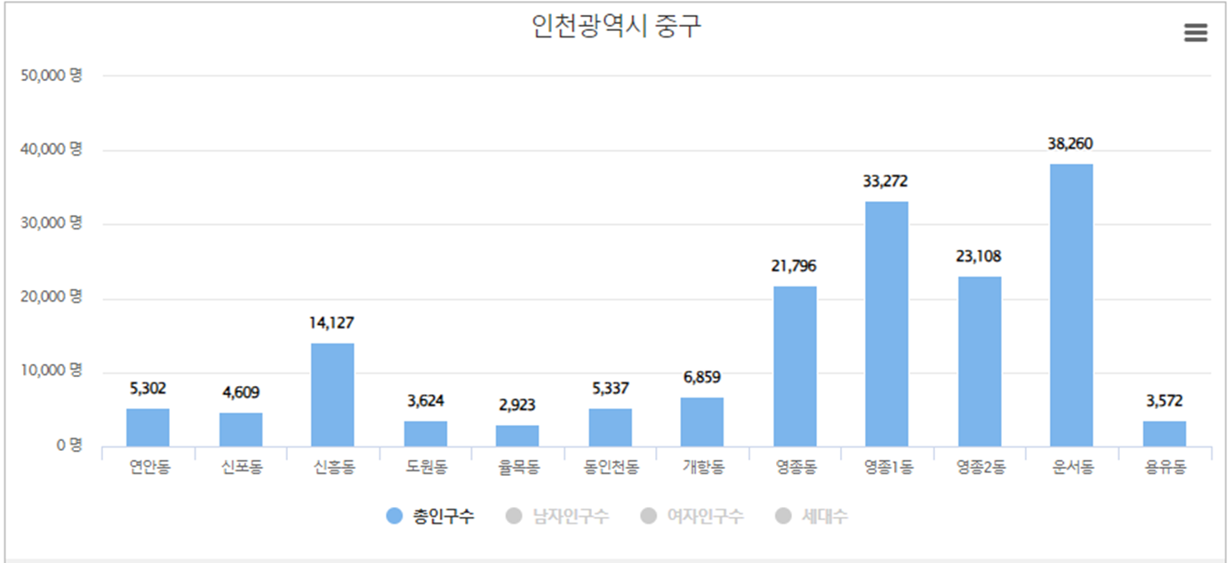 중구에서 운서동이 인구가 가장 많으며 인구는 38,260 명, 세대수는 22,060 입니다. 두번째로는 영종1동 인구가 많고 인구 33,272 명, 세대수는 13,501 입니다. 세번째는 영종2동으로 인구는 23,108 명, 세대수는 9,012 입니다.