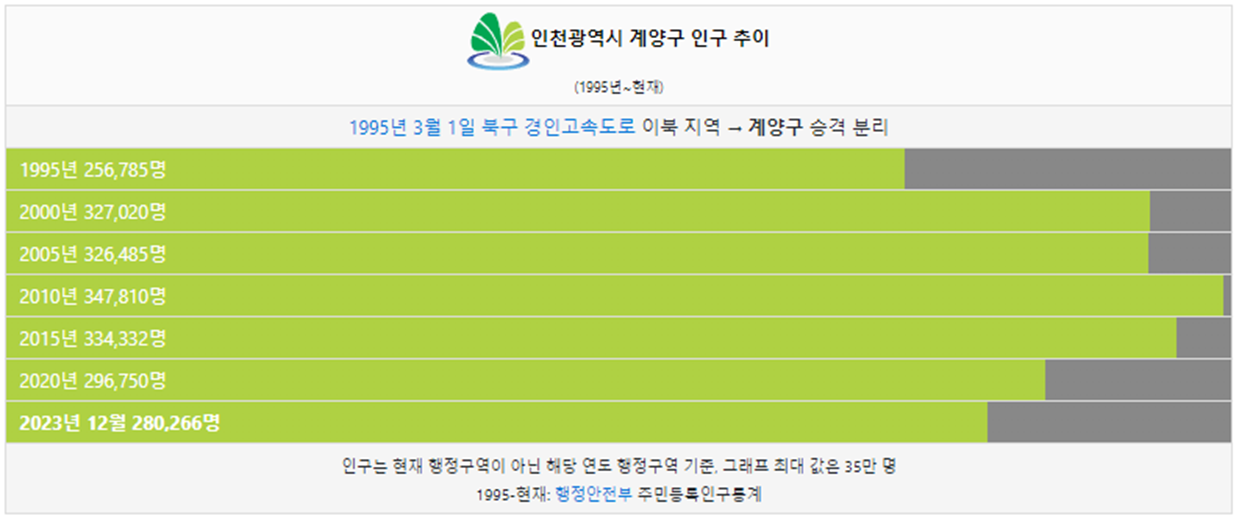 계양구 인구는 1995년 26만명 이었습니다. 그리고 2000년 인구가 처음으로 30만명을 돌파했고 이후에 인구가 계속해서 감소했습니다. 2024년 현재 28만명이 계양구에 거주하고 있습니다.