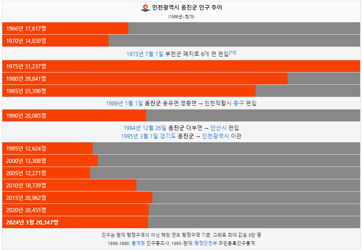 옹진군 인구는 1966년 1만 7천명 이었습니다. 그리고 1975년 인구가 처음으로 5만명을 돌파했고 이후에 인구 감소와 증가가 반복되었습니다. 2024년 현재 2만명이 옹진군에 거주하고 있습니다.