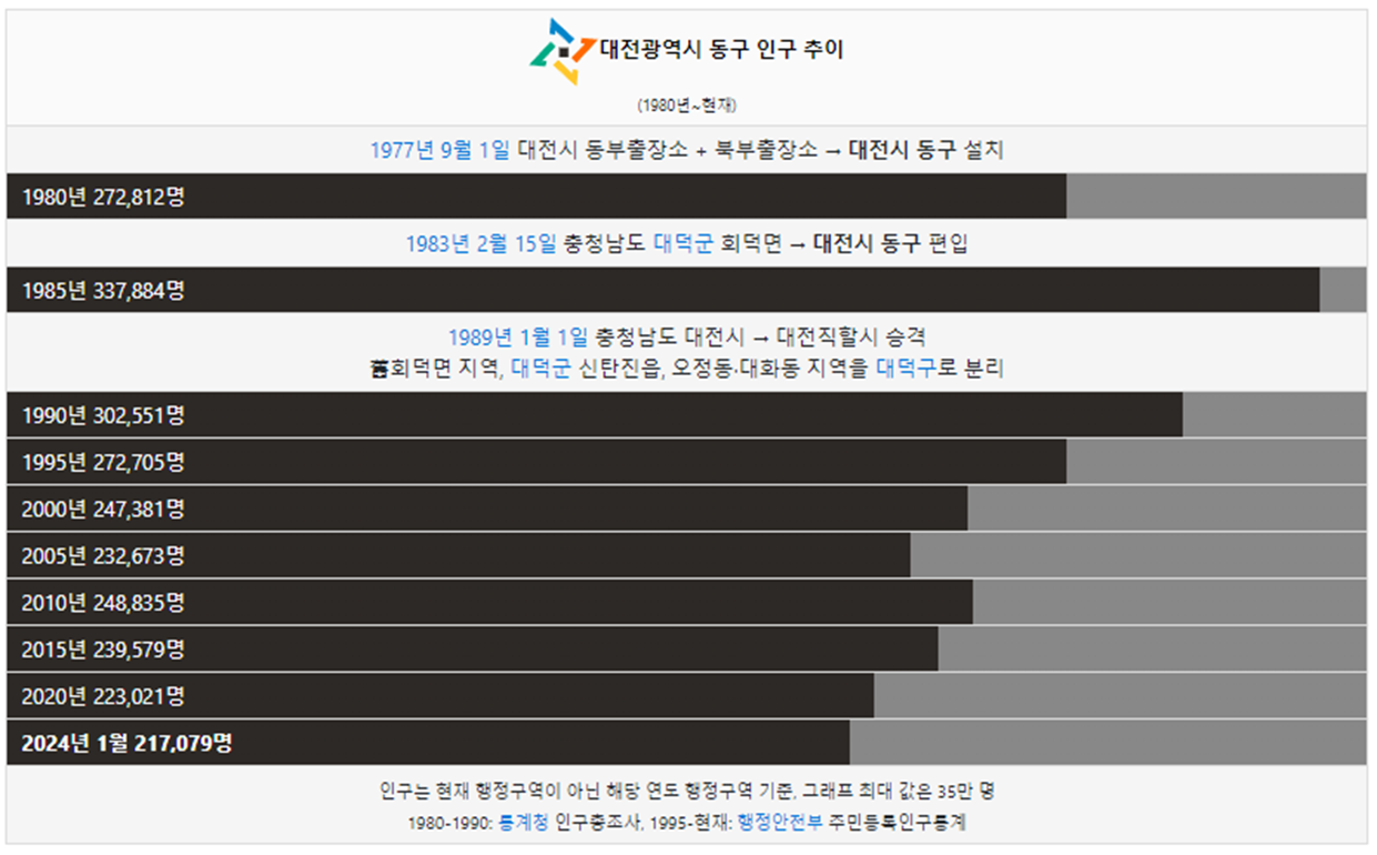 동구 인구는 1980년 33만명 이었습니다. 그리고 2000년 인구가 처음으로 25만명 이하가 되었고 이후에도 인구가 계속해서 감소했습니다. 2024년 현재 21만명이 동구에 거주하고 있습니다.