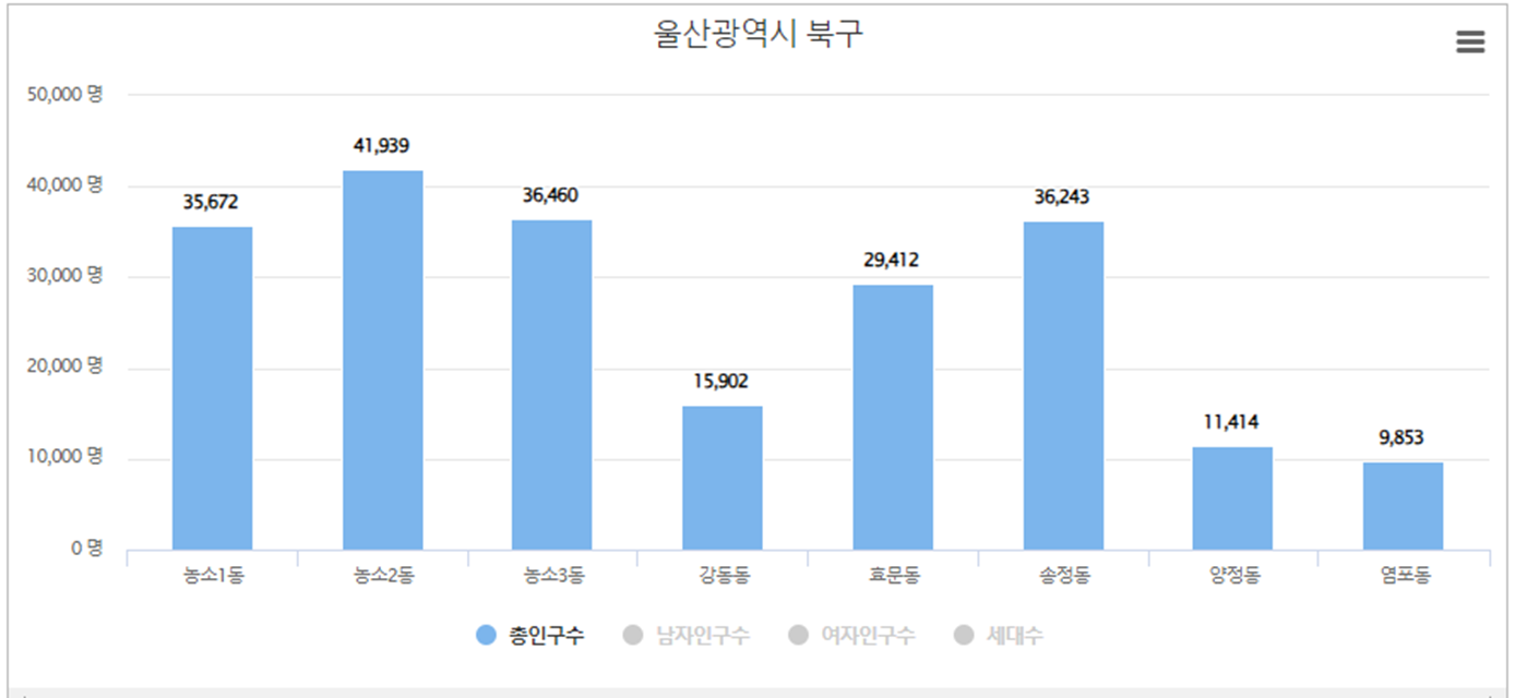 북구에서 농소2동이 인구가 가장 많으며 인구는 41,939 명, 세대수는 16,193 입니다. 두번째로는 농소3동 인구가 많고 인구 36,460 명, 세대수는 13,159 입니다. 세번째는 송정동으로 인구는 36,243 명, 세대수는 14,290 입니다.