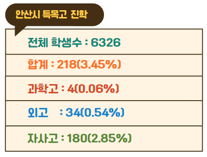 2022년 기준 안산시 지역에는 30개 중학교가 있고 중학교 학생수는 6326명입니다. 전체 학생 중 0.06%인 4명이 과학고에 진학했고 0.54%인 34명이 외국어고에 진학했습니다. 그리고 2.85%인 180명이 자립형 사립고에 진학했습니다. 전체 학생수 6326명 중 3.45%인 218명이 특목고에 진학했습니다.
