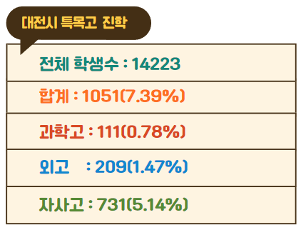2023년 기준 대전시 지역에는 89개 중학교가 있고 중학교 학생수는 14223명입니다. 전체 학생 중 0.78%인 111명이 과학고에 진학했고 1.47%인 209명이 외국어고에 진학했습니다. 그리고 5.14%인 731명이 자립형 사립고에 진학했습니다. 전체 학생수 14223명 중 7.39%인 1051명이 특목고에 진학했습니다.