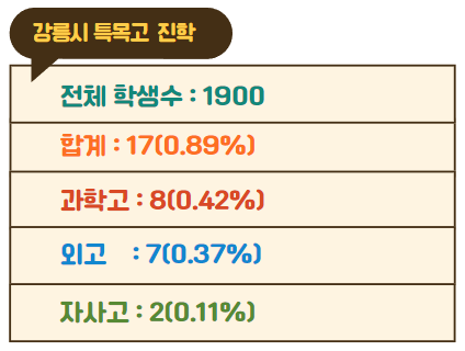 2022년 기준 강릉시 지역에는 12개 중학교가 있고 중학교 학생수는 1,745명입니다. 전체 학생 중 0.4%인 7명이 과학고에 진학했고 0.92%인 16명이 외국어고에 진학했습니다. 그리고 0.23%인 4명이 자립형 사립고에 진학했습니다. 전체 학생수 1,745명 중 1.55%인 27명이 특목고에 진학했습니다.