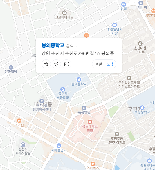 춘천시에서 세 번째로 특목고에 많이 진학한 학교는 봉의중학교로 강원도 춘천시 춘천로296번길 55번지에 위치합니다. 봉의중학교의 학생수는 174명이며 과학고는 2명, 외고는 2명, 자사고에는 0명이 진학했습니다. 봉의중학교의 전체 학생 중 2.3%인 4명이 특목고에 진학했습니다.