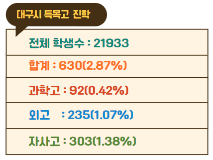 2023년 기준 대구시 지역에는 127개 중학교가 있고 중학교 학생수는 21933명입니다. 전체 학생 중 0.42%인 92명이 과학고에 진학했고 1.07%인 235명이 외국어고에 진학했습니다. 그리고 1.38%인 303명이 자립형 사립고에 진학했습니다. 전체 학생수 21933명 중 2.87%인 630명이 특목고에 진학했습니다.