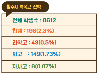 2023년 기준 청주시 지역에는 47개 중학교가 있고 중학교 학생수는 8612명입니다. 전체 학생 중 0.5%인 43명이 과학고에 진학했고 1.73%인 149명이 외국어고에 진학했습니다. 그리고 0.07%인 6명이 자립형 사립고에 진학했습니다. 전체 학생수 8612명 중 2.3%인 198명이 특목고에 진학했습니다.