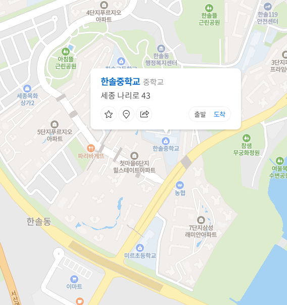 세종시에서 세 번째로 특목고에 많이 진학한 학교는 한솔중학교로 세종시 나리로 43번지에 위치합니다. 한솔중학교의 학생수는 293명이며 과학고는 3명, 외고는 9명, 자사고에는 4명이 진학했습니다. 한솔중학교의 전체 학생 중 5.46%인 16명이 특목고에 진학했습니다.