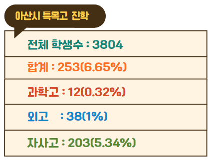 2023년 기준 아산시 지역에는 20개 중학교가 있고 중학교 학생수는 3804명입니다. 전체 학생 중 0.32%인 12명이 과학고에 진학했고 1%인 38명이 외국어고에 진학했습니다. 그리고 5.34%인 203명이 자립형 사립고에 진학했습니다. 전체 학생수 3804명 중 6.65%인 253명이 특목고에 진학했습니다.