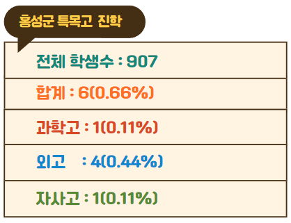 2023년 기준 홍성군 지역에는 10개 중학교가 있고 중학교 학생수는 907명입니다. 전체 학생 중 0.11%인 1명이 과학고에 진학했고 0.44%인 4명이 외국어고에 진학했습니다. 그리고 0.11%인 1명이 자립형 사립고에 진학했습니다. 전체 학생수 907명 중 0.66%인 6명이 특목고에 진학했습니다.