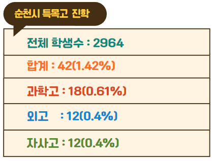 2023년 기준 순천시 지역에는 22개 중학교가 있고 중학교 학생수는 2964명입니다. 전체 학생 중 0.61%인 18명이 과학고에 진학했고 0.4%인 12명이 외국어고에 진학했습니다. 그리고 0.4%인 12명이 자립형 사립고에 진학했습니다. 전체 학생수 2964명 중 1.42%인 42명이 특목고에 진학했습니다.