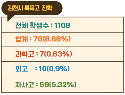 2023년 기준 김천시 지역에는 15개 중학교가 있고 중학교 학생수는 1108명입니다. 전체 학생 중 0.63%인 7명이 과학고에 진학했고 0.9%인 10명이 외국어고에 진학했습니다. 그리고 5.32%인 59명이 자립형 사립고에 진학했습니다. 전체 학생수 1108명 중 6.86%인 76명이 특목고에 진학했습니다.