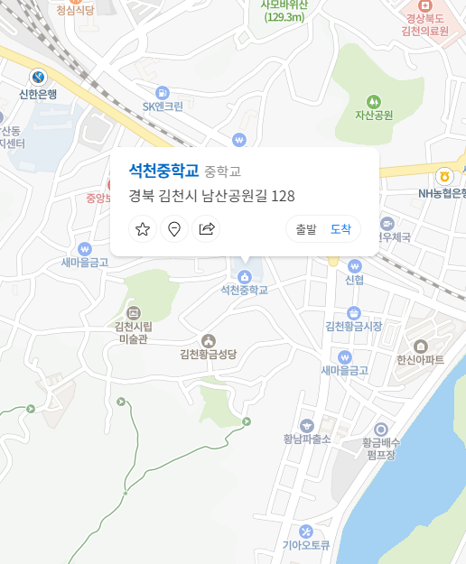 김천시에서 세 번째로 특목고에 많이 진학한 학교는 김천석천중학교로 김천시 남산공원길 128번지에 위치합니다. 김천석천중학교의 학생수는 76명이며 과학고는 0명, 외고는 1명, 자사고에는 9명이 진학했습니다. 김천석천중학교의 전체 학생 중 13.16%인 10명이 특목고에 진학했습니다.