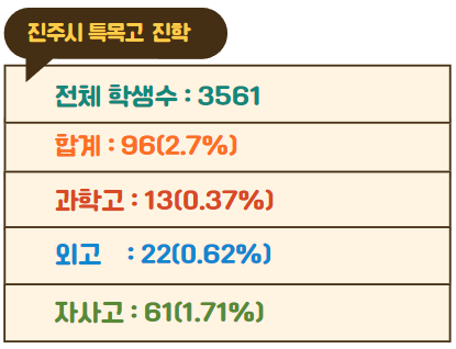 2023년 기준 진주시 지역에는 22개 중학교가 있고 중학교 학생수는 3561명입니다. 전체 학생 중 0.37%인 13명이 과학고에 진학했고 0.62%인 22명이 외국어고에 진학했습니다. 그리고 1.71%인 61명이 자립형 사립고에 진학했습니다. 전체 학생수 3561명 중 2.7%인 96명이 특목고에 진학했습니다.