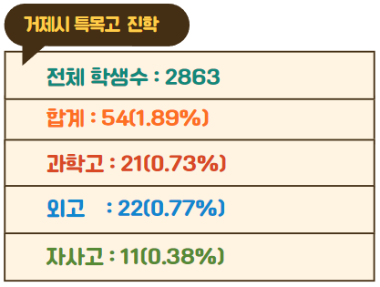 2023년 기준 거제시 지역에는 19개 중학교가 있고 중학교 학생수는 2863명입니다. 전체 학생 중 0.73%인 21명이 과학고에 진학했고 0.77%인 22명이 외국어고에 진학했습니다. 그리고 0.38%인 11명이 자립형 사립고에 진학했습니다. 전체 학생수 2863명 중 1.89%인 54명이 특목고에 진학했습니다.