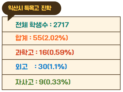 2023년 기준 익산시 지역에는 26개 중학교가 있고 중학교 학생수는 2717명입니다. 전체 학생 중 0.59%인 16명이 과학고에 진학했고 1.1%인 30명이 외국어고에 진학했습니다. 그리고 0.33%인 9명이 자립형 사립고에 진학했습니다. 전체 학생수 2717명 중 2.02%인 55명이 특목고에 진학했습니다.
