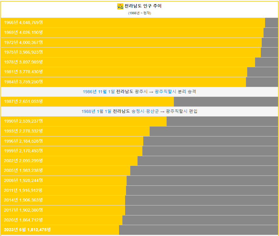 전라남도 인구는 1966년 404만명 이었습니다. 이후 인구가 지속적으로 감소하였고 1986년 광주직할시가 분리 승격되면서 265만명으로 감소하였습니다. 2023년 현재 181만명이 전라남도에 거주하고 있습니다.