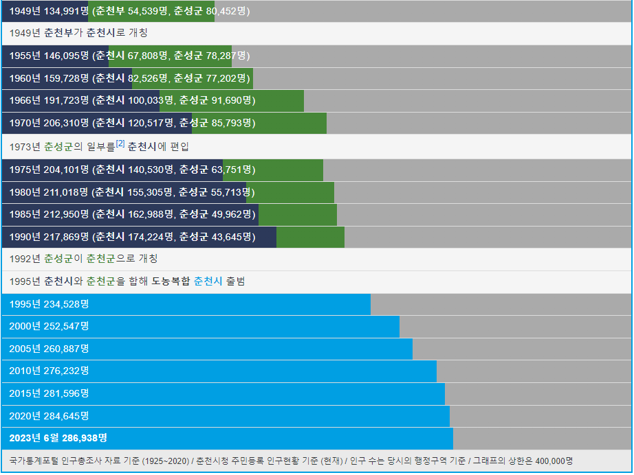 춘천시 인구는 1949년 13만명 이었습니다. 그리고 1970년 처음으로 20만명을 돌파했고 이후 인구가 꾸준히 증가하였습니다. 2023년 현재 28만명이 춘천시에 거주하고 있습니다.
