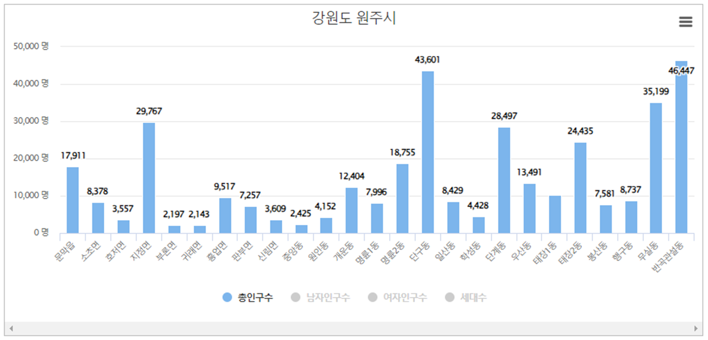 원주시에서 반곡관설동 인구가 가장 많으며 인구는 46,447명, 세대수는 19,974입니다. 두번째로는 단구동 인구가 많고 인구 43,601명, 세대수는 20,010입니다. 세번째는 무실동으로 인구는 35,199, 세대수는 15,485입니다.