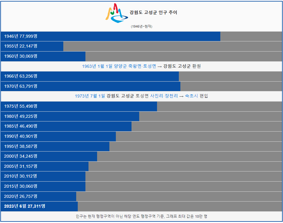 고성군 인구는 1946년 7만명 이었습니다. 이후 최근까지 인구가 꾸준히 감소하고 있습니다. 2023년 현재 2만명이 고성군에 거주하고 있습니다.