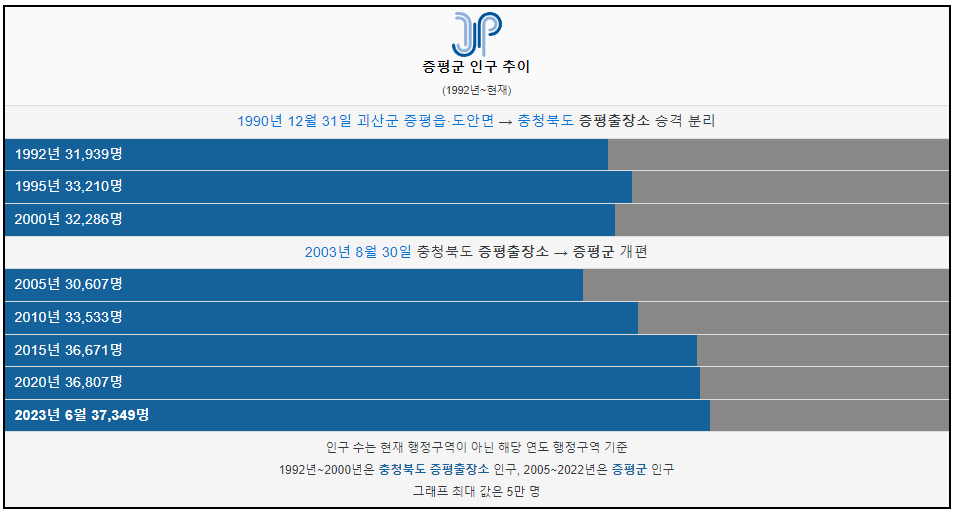 증평군 인구는 1922년 3만명 이었습니다. 이후 인구가 크게 증가하거나 감소하지 않았습니다. 2023년 현재 3만명이 증평군에 거주하고 있습니다.