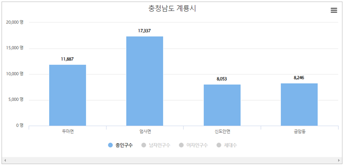계룡시에서 엄사면 인구가 가장 많으며 인구는 17,337명, 세대수는 7,734입니다. 두번째로는 두마면 인구가 많고 인구 11,887명, 세대수는 5,111입니다. 세번째는 금암동으로 인구는 8,246, 세대수는 3,365입니다.