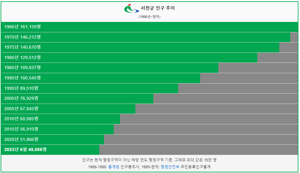 서천군 인구는 1966년 16만명 이었습니다. 그리고 1995년 처음으로 10만명 이하로 감소했고 이후로도 인구가 꾸준히 감소하였습니다. 2023년 현재 5만명이 서천군에 거주하고 있습니다.