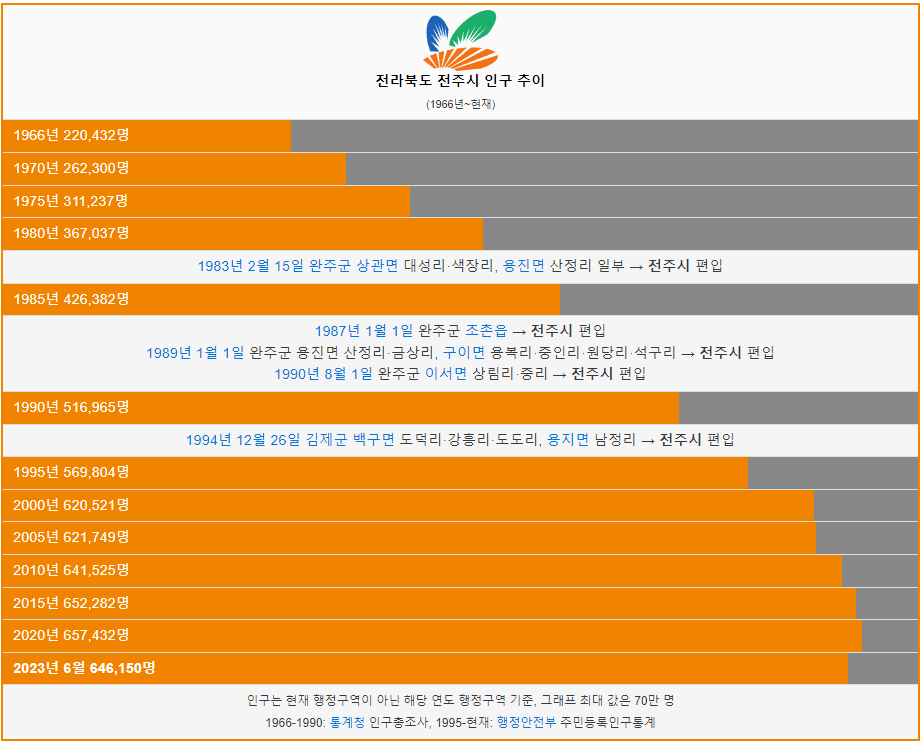 전주시 인구는 1966년 22만명 이었습니다. 그리고 1990년 처음으로 50만명을 돌파했고 이후 인구가 꾸준히 증가했습니다. 2023년 현재 64만명이 전주시에 거주하고 있습니다.