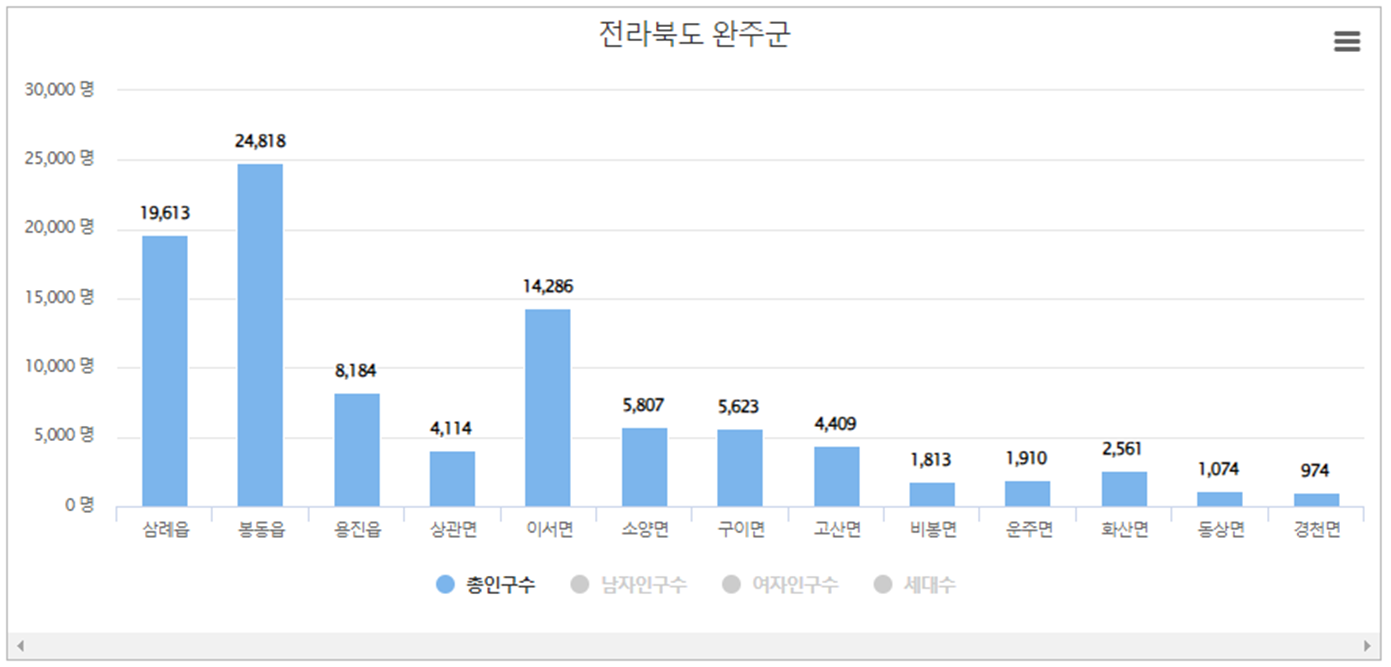 완주군에서 봉동읍 인구가 가장 많으며 인구는 24,818명, 세대수는 10,925입니다. 두번째로는 삼례읍 인구가 많고 인구 19,613명, 세대수는 10,184입니다. 세번째는 이서면으로 인구는 14,286, 세대수는 6,853입니다.